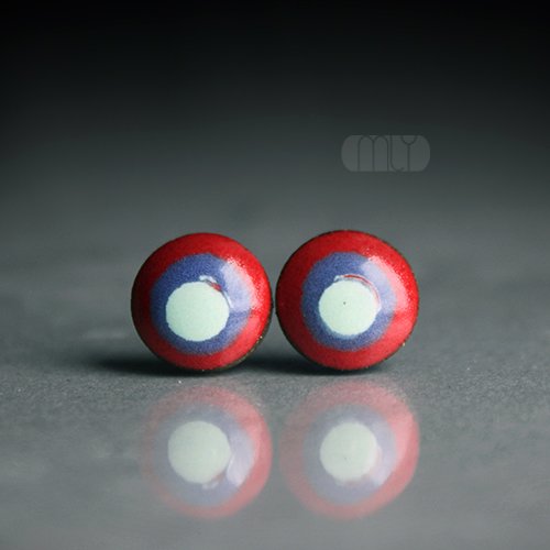 Ceramiczne okrągłe kolczyki w formie sztyftów, ręcznie wykonane z delikatnej gliny kamionkowej, jednostronnie szkliwione mieszanką czerwonych fioletowych i blado zielonych szkliw z efektem plamek, na antyalergicznych sztyftach w kolorze srebrnym. Średnica ok. 11mm. Polecam