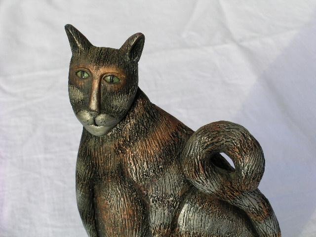 Fantastyczna Duża rzeźbiarska artystyczna figurka kociej oczywistości z charakterem. Z kolekcjonerskiej serii "Cats Rule" (Koty Rządzą) autorstwa Marthy McCarthy. Ciężka solidna żywica z miedziano-srebrzystym wybarwieniem, bardzo precyzyjnie i z polotem zarazem zdobiona. Kot ten jaką jest osobowością - każdy widzi :) Sygnowana. 9 x 5 x 15 cm. Bardzo dekoracyjna. Świetna do kolekcji i na prezent dla kociarza :) Stan zachowania bardzo dobry. Wartość kolekcjonerska.