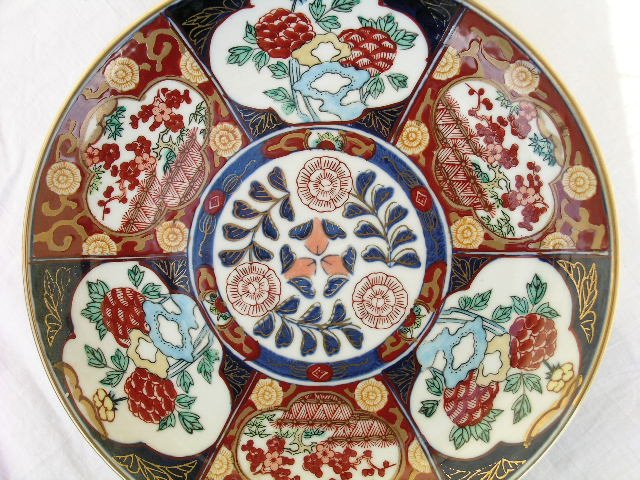 Duży, ręcznie malowany talerz, oryginalnie japoński, sygnowany, na bogato mandalicznie zdobiony wg tradycyjnego wzoru Imari. Głębia kolorów, błyszcząco-satynowe wykończenie, złocenia i szlachetna fakturowość ręcznej malatury. Porcelana jakościowa, solidna. Z tyłu dziurki do powieszenia. 24 x 3 cm. Stan zachowania bardzo dobry. Dawny wyrób z klasą i urokiem prawdziwego orientu.