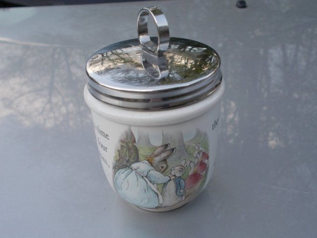 Wyjątkowy, wartościowy, rzadko spotykany DUŻY pojemnik do przygotowywania, gotowania i podawania jajek w stylu angielskim, sygnowany jakością WEDGWOOD Made in England z kolekcjoenrskiej serii PETER RABBIT Copyright Frederick Warne & Co. Solidna gruba, ciężka, szlachetna porcelana, na błyszcząco szkliwiona. Użytkowa - Oven to table. Nie spotykany często przedmiot seria z 1970 roku...Chromowa przykrywka na gwint nakręcana, ze specjalnie przygotowaną dziurką uchwytową do wyjmowania z wrzątku. Piękne, baśniowe zdobienie z obu stron różne i wierszowane napisy..." Once upon a time there were four little Rabbits and their names were Flopsy, Mopsy, Cotton-tail, and Peter. . Dół 4; średnica 7;góra 6 wysokość 11 cm. Stan naczynia bardzo dobry; przykrywka z zarysowaniami lubego użytkowania :) Oryginalny, w apetycznym, angielskim stołowym stylu :) Kolekcjonerski.