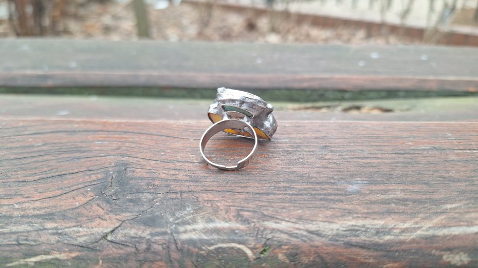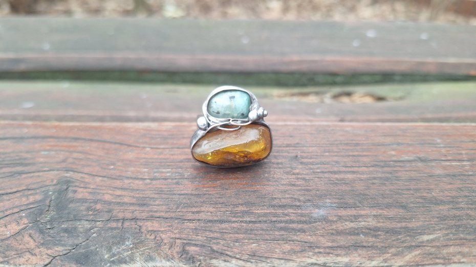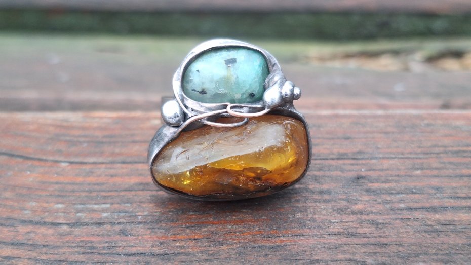 Pierścionek wykonany z miedzi, cyny, chryzoprazu i bursztynu. Wymiary ok. 2 na 2.5 cm. Regulowany. Nie jest ciężki.