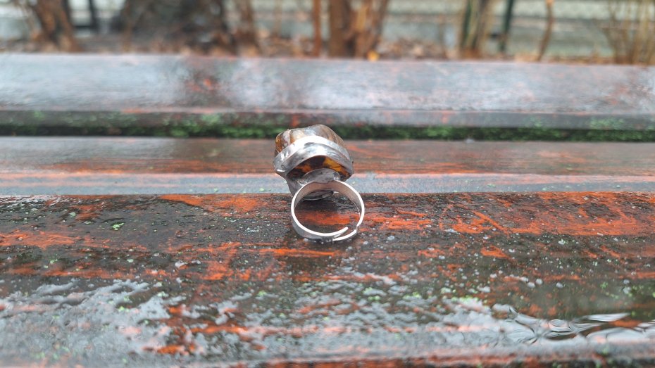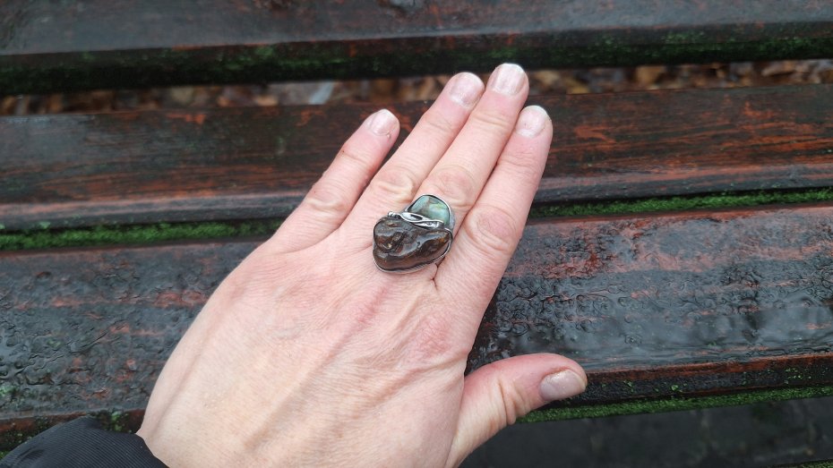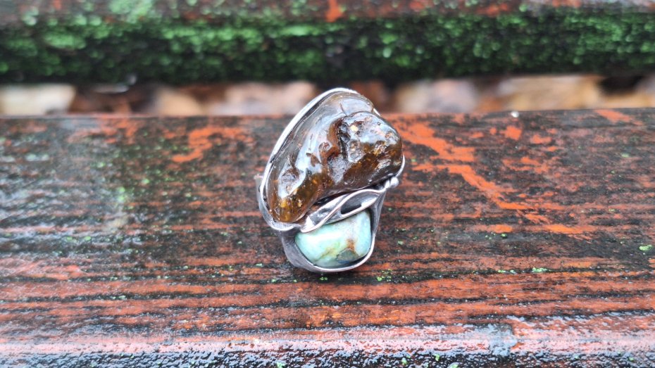Pierścionek wykonany z miedzi, cyny, chryzoprazu i bursztynu. Wymiary ok. 2.5 na 2 cm. Regulowany. Nie jest ciężki.