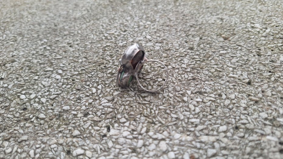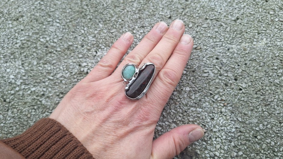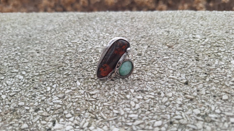 Pierścionek wykonany z miedzi, cyny, chryzoprazu i bursztynu. Wymiary ok. 3.5 na 2.5 cm. Regulowany. Nie jest ciężki.