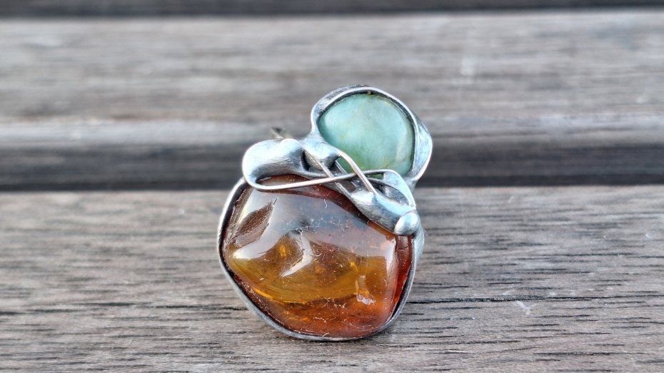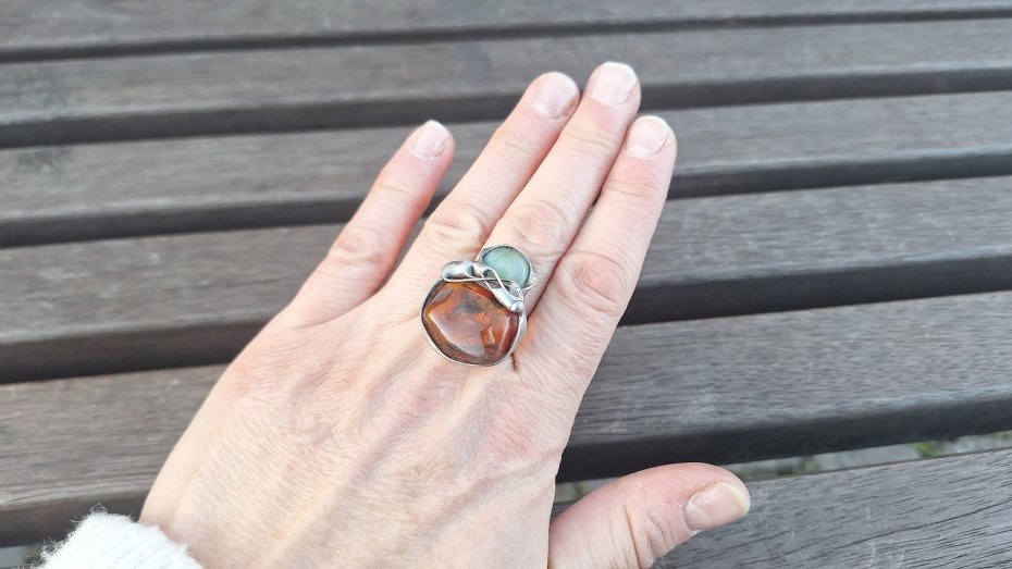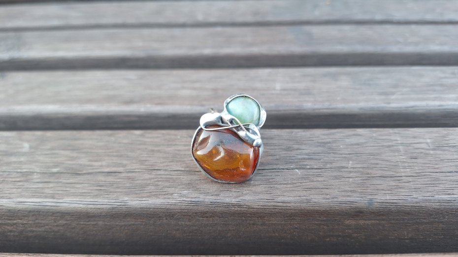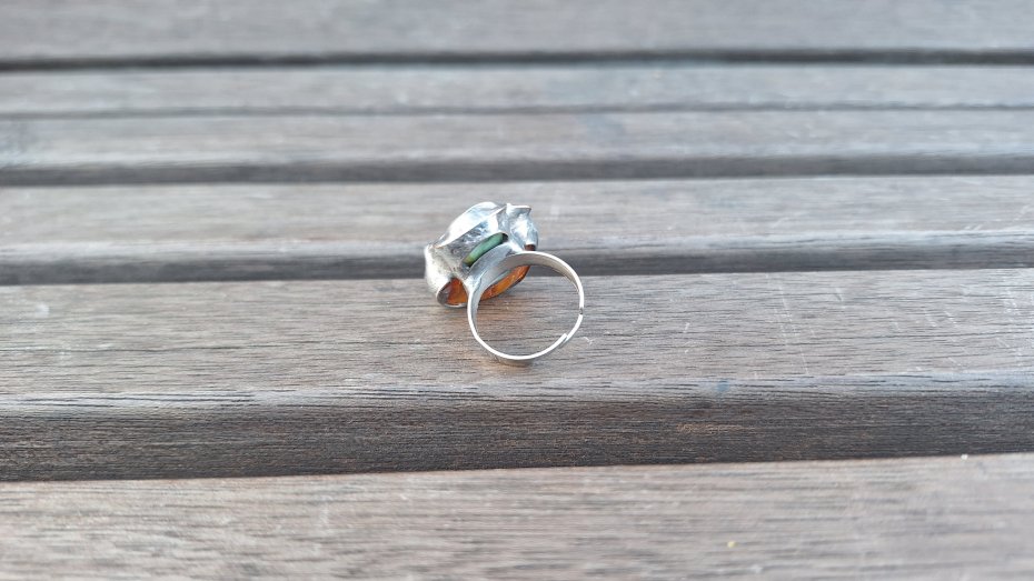 Pierścionek wykonany z miedzi, cyny, chryzoprazu i bursztynu. Wymiary ok. 2.8 na 2 cm. Regulowany. Nie jest ciężki.