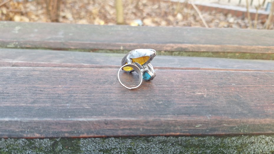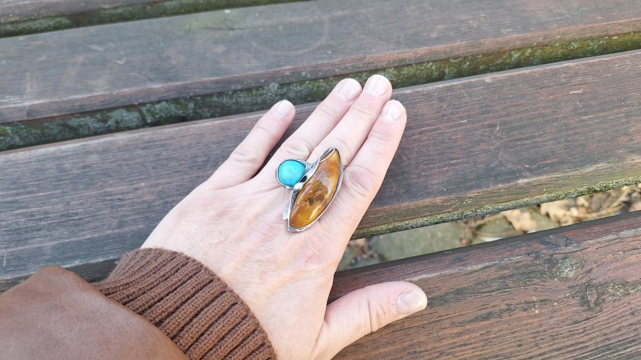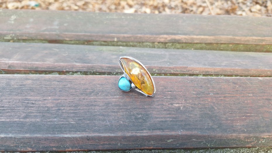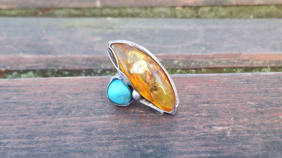 Pierścionek wykonany z miedzi, cyny, howlitu i bursztynu. Wymiary ok. 4 na 2.5 cm. Regulowany. Nie jest ciężki.