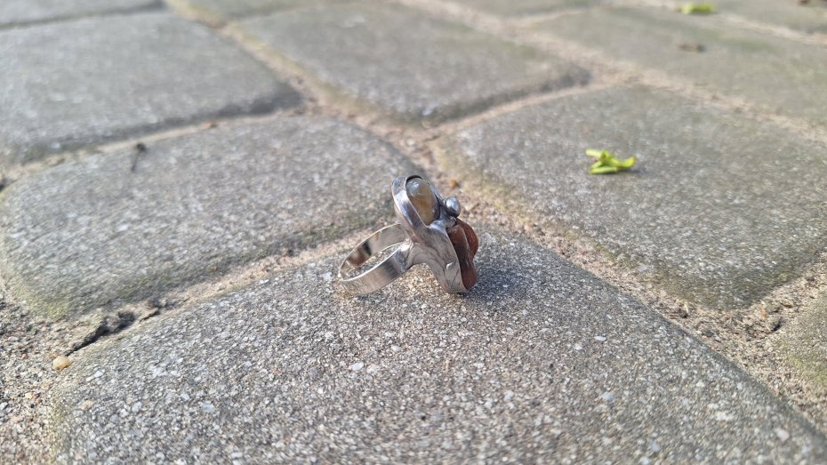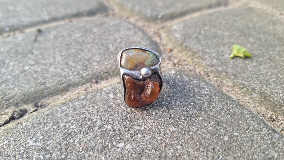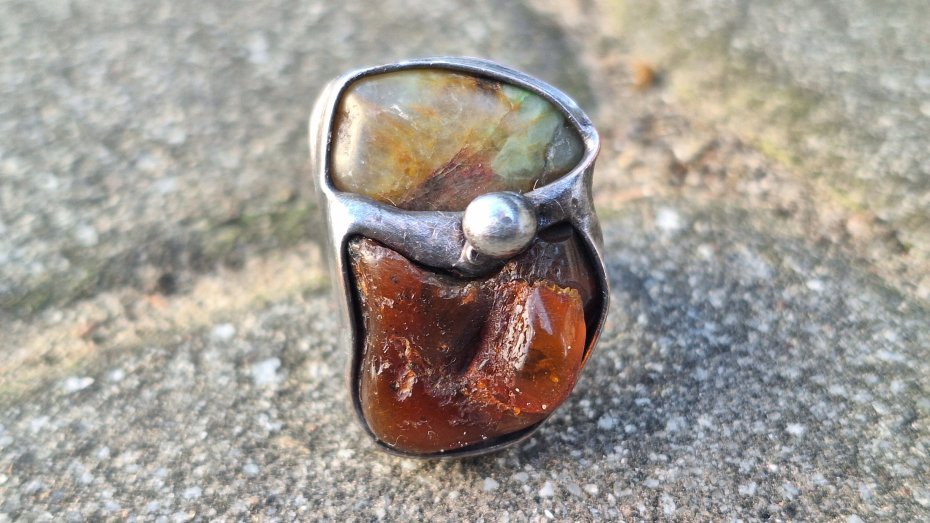 Pierścionek wykonany z miedzi, cyny, chryzoprazu i bursztynu. Wymiary ok. 2.5 na 1.8 cm. Regulowany. Nie jest ciężki.