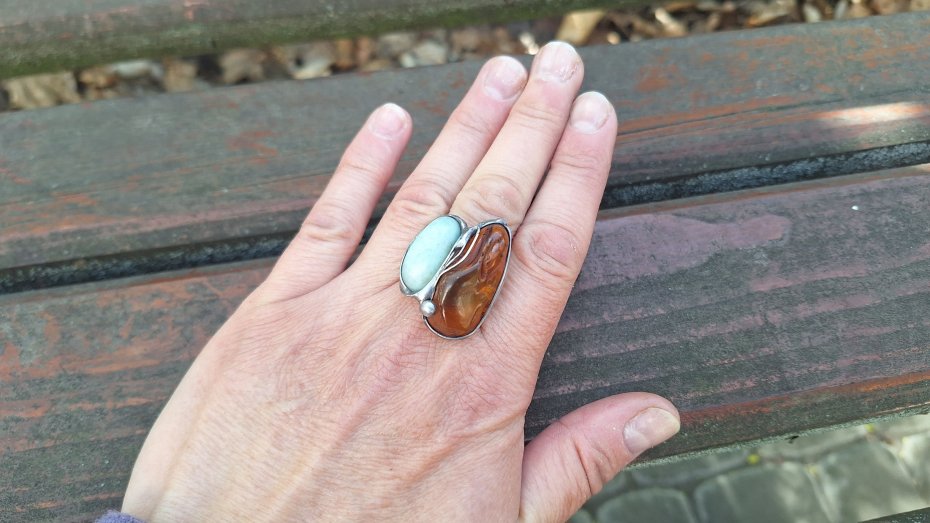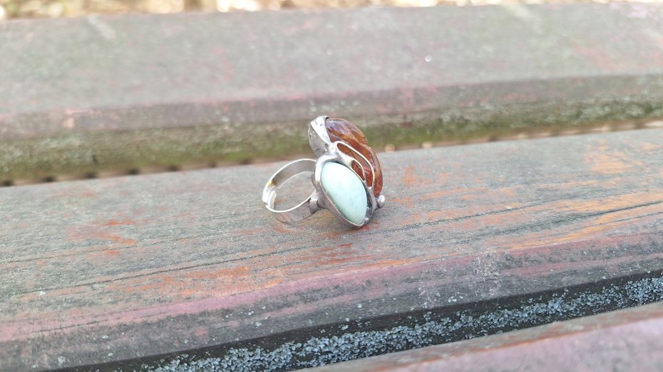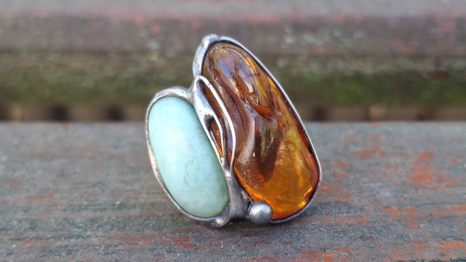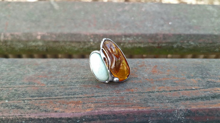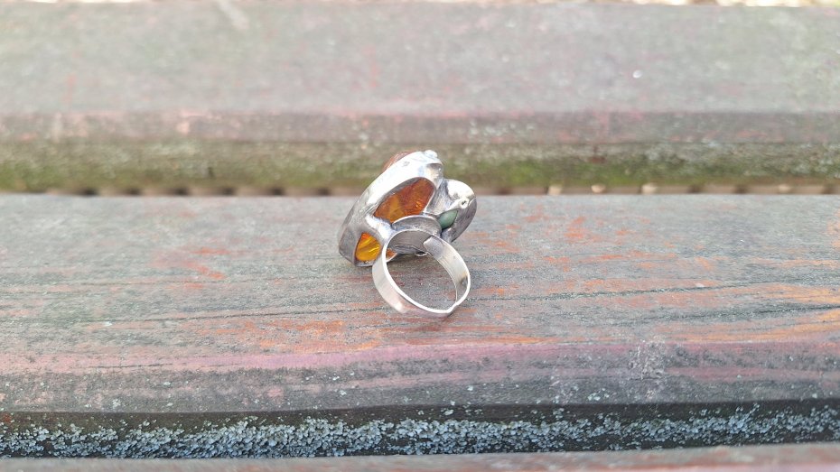 Pierścionek wykonany z miedzi, cyny, chryzoprazu i bursztynu. Wymiary ok. 3 na 2.2 cm. Regulowany. Nie jest ciężki.