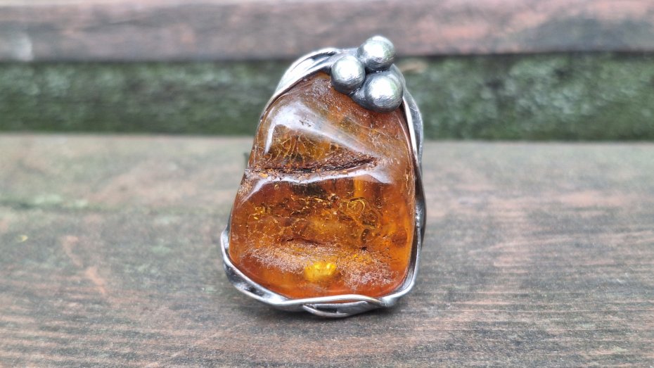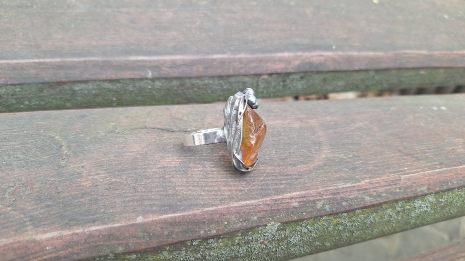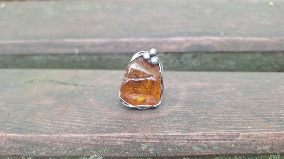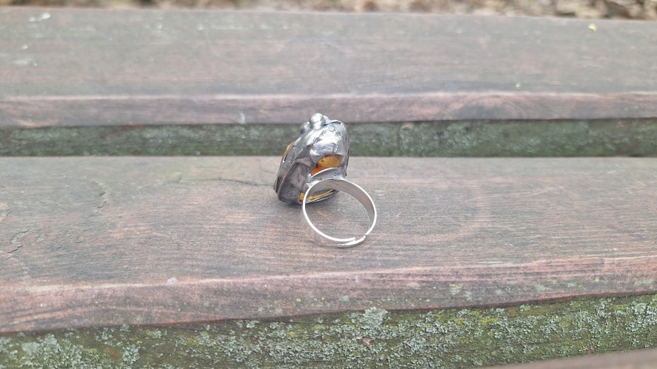 Pierścionek wykonany z miedzi, cyny i bursztynu. Wymiary ok. 2.8 na 2.3 cm. Regulowany. Nie jest ciężki.
