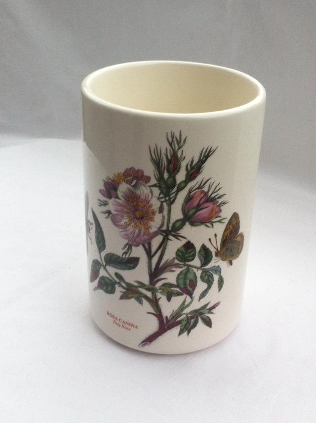 Ogromny porcelanowy Pojemnik kuchenny, sygnowany PORTMEIRION Made in England z rysunkami Susan Williams Ellis. Z kultowej serii BOTANIC GARDEN /Dishwasher proof; oven to table; freezer & microwave safe/. W pełni użytkowy i przepięknie zdobiony. Wyjątkowy, rzadko spotykany motyw na malaturze. Mocny, szlachetny. Ciepła biel porcelany i przyjemne dla oka żywe barwy. Całość na błyszcząco szkliwiona. Doskonały na kuchenne łyżki, ale i do łazienki lub jako wazon. Średnica 10,5; wysokość 16,5 cm. Stan zachowania bardzo dobry.