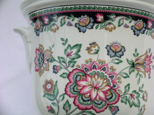 Pięknym, misternym wzorem kwiatowym zdobione duże naczynie porcelanowe, z założenia wytworna osłonka doniczkowa, ale i w łazience, i w kuchni dekoracyjnie i praktycznie sprawdzić się może. Sygnatura Royal Winton, klasa od Staffordshire. Niezwykła precyzja malatury, widać każdą kropeczkę, cieniowanie kwiatowych płatków... bardzo efektowne zestawienie kolorów. Złocenie rantów, błyszczące szkliwienie. Dół 8,5; góra 14; wysokość 13 cm. Stan zachowania bardzo dobry. Wytworność i klasa.