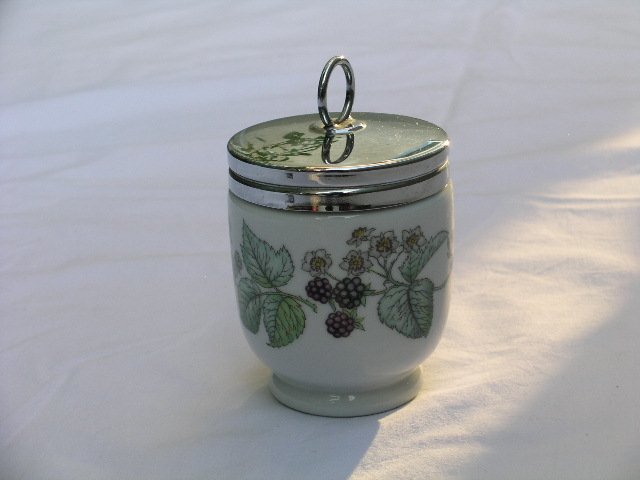 Wyjątkowo duży, szlachetny, praktyczny i wyjątkowy pojemnik do przygotowywania, gotowania i podawania jajek w stylu angielskim, sygnowany jakością Royal Worcester - solidna gruba porcelana, na błyszcząco szkliwiona. Chromowa przykrywka na gwint nakręcana, ze specjalnie przygotowaną dziurką uchwytową do wyjmowania z wrzątku. Piękne jeżynowe zdobienie. Dół 4,5; średnica 7; wysokość 11 cm. Stan naczynia bardzo dobry; przykrywka z zarysowaniami lubego użytkowania :) Oryginalny, w apetycznym, angielskim stołowym stylu :)