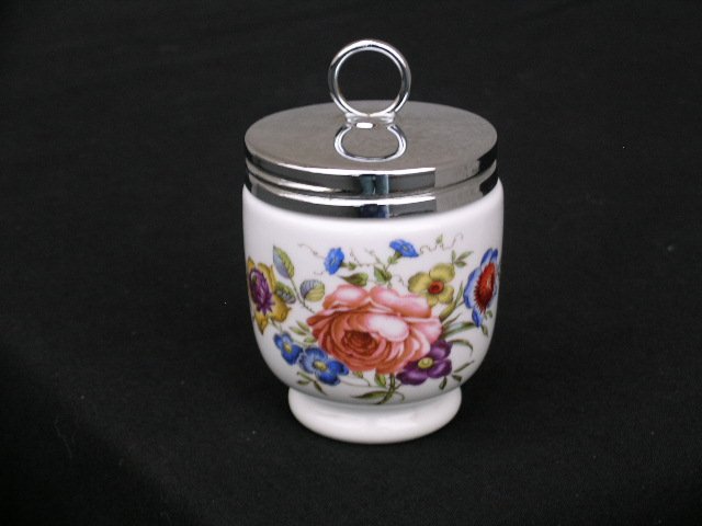 Wyjątkowo duży, szlachetny, praktyczny i wyjątkowy pojemnik do przygotowywania, gotowania i podawania jajek w stylu angielskim, sygnowany jakością Royal Worcester - solidna gruba porcelana, na błyszcząco szkliwiona. Chromowa przykrywka na gwint nakręcana, ze specjalnie przygotowaną dziurką uchwytową do wyjmowania z wrzątku. Piękne kwiatowe zdobienie. Dół 4,5; średnica 7; wysokość 11 cm. Stan naczynia bardzo dobry; przykrywka z zarysowaniami lubego użytkowania :) Oryginalny, w apetycznym, angielskim stołowym stylu :)