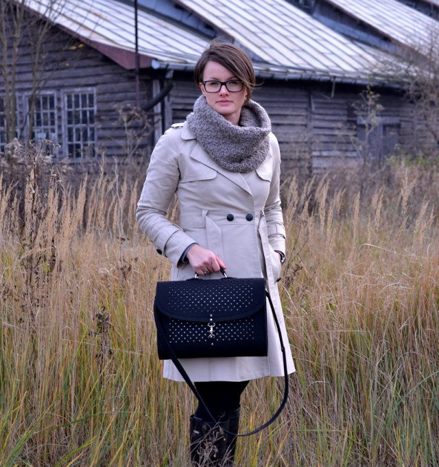 Wzór: kółeczka o średnicy 5 mm wycięte z obu stron torebki podszyte od spodu beżową skórą ekologiczną.