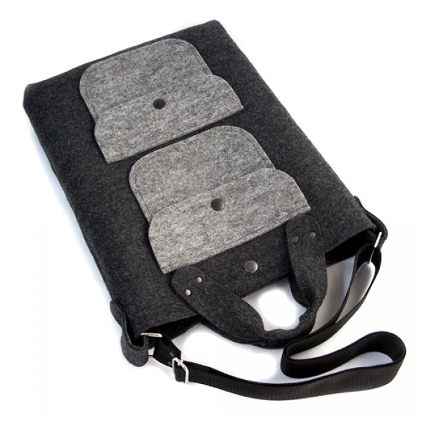 Bardzo pojemna torba do noszenia na skos, na ramię lub w ręce. Zaprojektowana i uszyta z grubego i sztywnego filcu. Przód torebki ozdobiony dwoma kieszonkami. Torba zapinana na nap. Wymiary torby: wysokość 37,5cm, szerokość 30cm, głębokość 5cm. Długość paska max ok.110cm. Pomieści bardzo dużo rzeczy, format A4 również. Jest bardzo wygodna i praktyczna. Torebka zostanie wysłana w paczce zabezpieczającej jej pogniecenie.