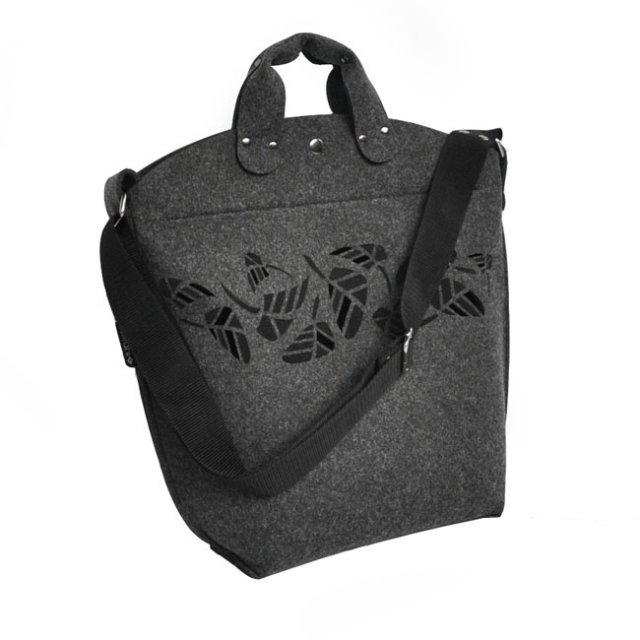 Bardzo pojemna, trwała i praktyczna torba . Najwygodniej nosić ją w ręce lub jako listonoszkę - na skos. Uszyta z filcu 100% poliestrowego. Przód torebki ozdobiony grawerowanym wzorem z motywem liści. Torba zapinana na nap i zamek. Wewnątrz znajduje się kieszeń zamykana na zamek. Części torebki wycięte laserowo. Torebka ta nie będzie się mechacić ponieważ jest uszyta stroną impregnowaną na zewnątrz.