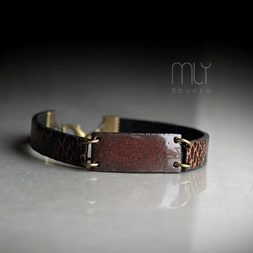 Efektowna bransoletka wykonana ze skórzanego rzemienia jubilerskiego w kolorze brązowym, elementów w kolorze starego złota i ręcznie wykonanego ceramicznego elementu szkliwionego mieszanką brązowych szkliw z efektem plamek. Obwód regulowany. Polecam