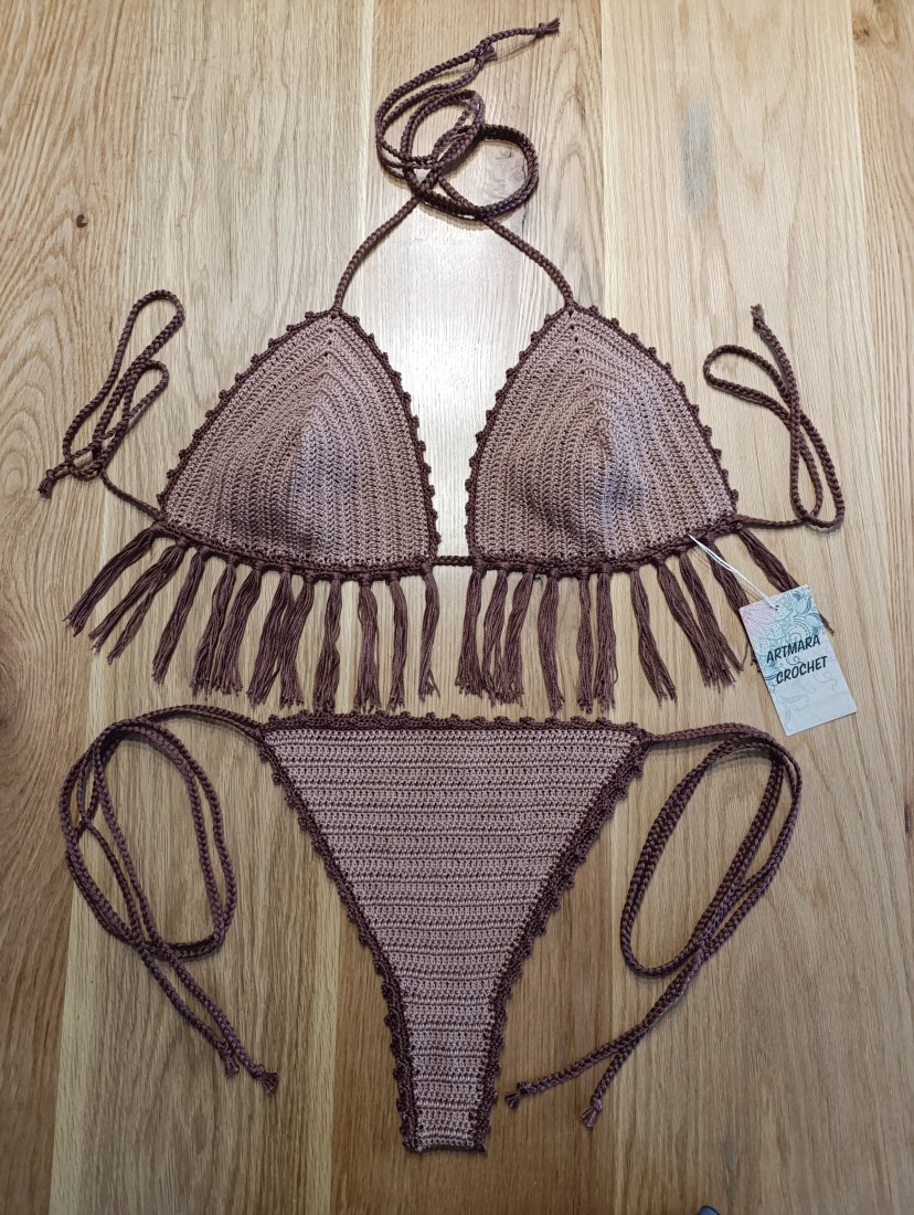 Kostium kąpielowy zrobiony na szydełku z bawełnianej włóczki w kolorze beżowo brązowym. Przy staniku efektowne frędzle.