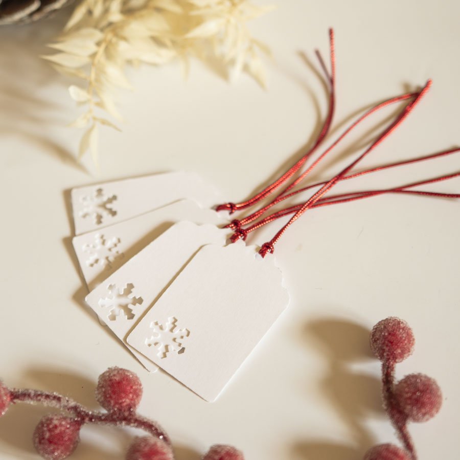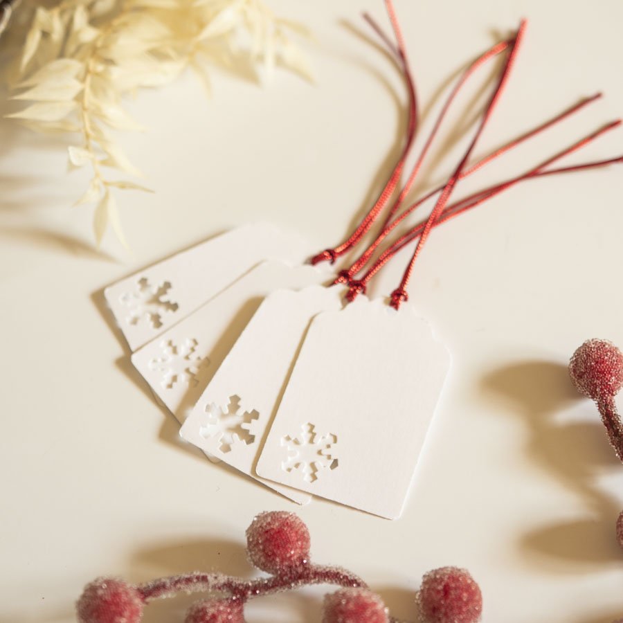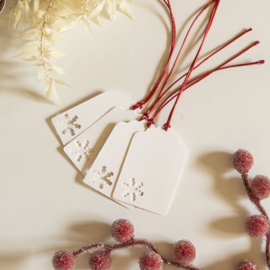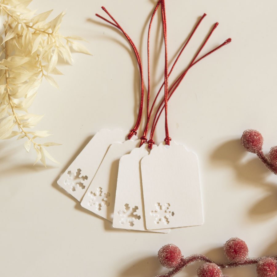 Komplet 10 bilecików do prezentów z białego papieru, zdobionych wycięciem w kształcie śnieżynki.