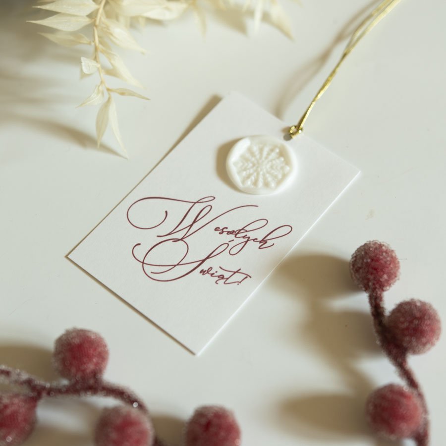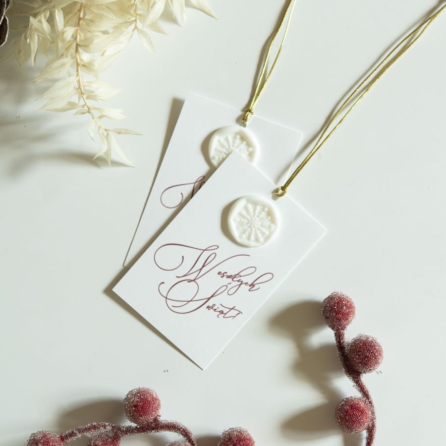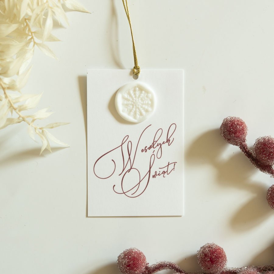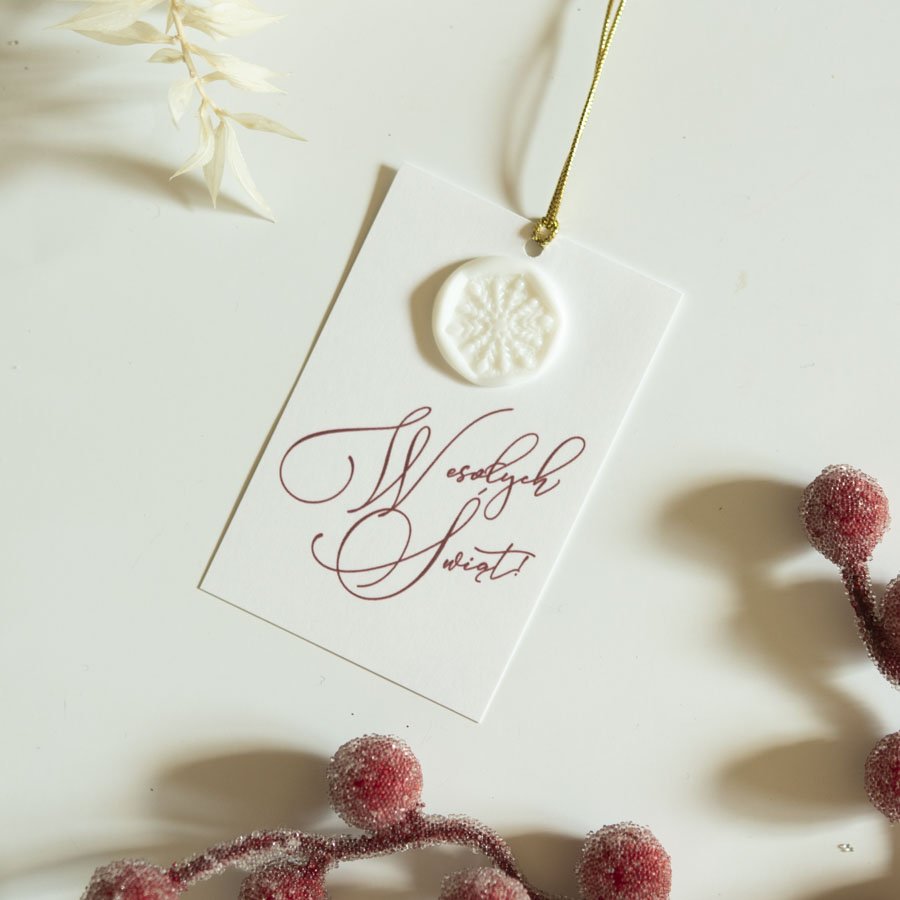 Komplet 10 bilecików do prezentów z białego papieru, zdobionych kaligraficznym napisem i białą pieczęcią ze śnieżynką.