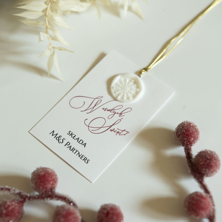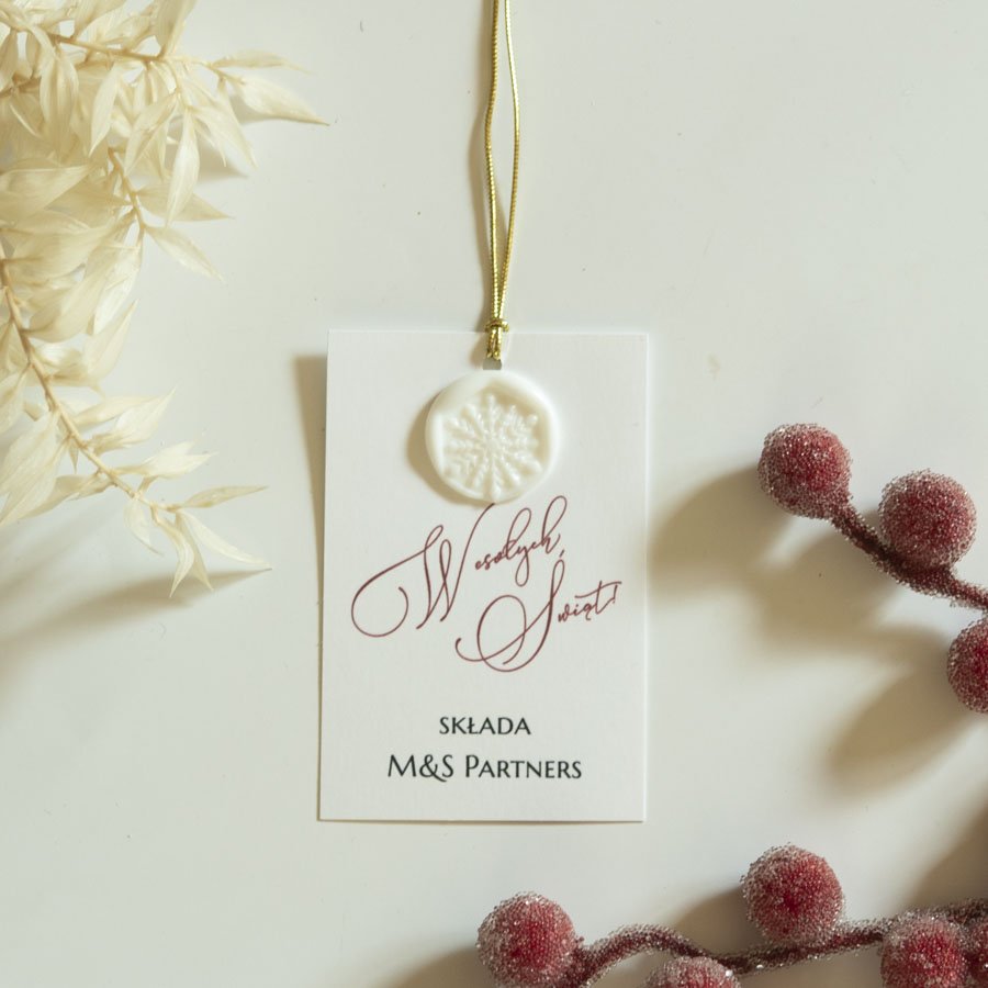 Komplet 10 bilecików do prezentów z białego papieru, zdobionych kaligraficznym napisem i białą pieczęcią ze śnieżynką.