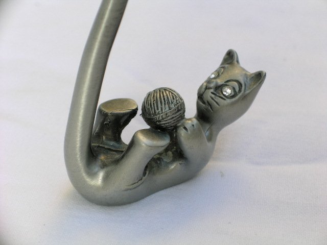 Metalowy, przyjemnie ciężki kotek na pierścionki. Odpowiednio długi ogon no i ta poza :) Oczy cyrkoniowe, światłolubne. Satynowe wykończenie. 5 x 2,5 x 8,5 cm. Stan zachowania bardzo dobry.