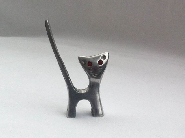 Metalowy kotek - stojaczek na pierścionki :) Aluminium i oczy z czerwonych rubinkowych paciorków. Uroczy. 5 x 1,5 x 7,5 cm. Stan zachowania bardzo dobry.