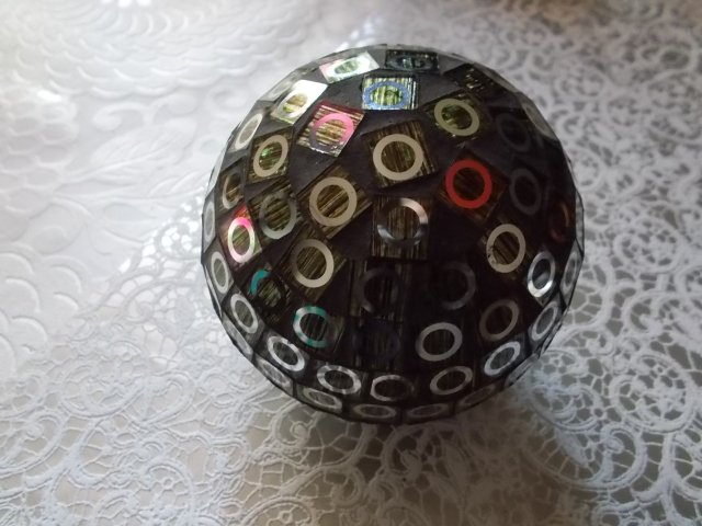 Dekoracyjna kula...Niesamowita ozdoba...Efekty w zależności od oświetlenia od wręcz pryzmatycznych błysków po zebranie koloru z otoczenia / to akurat widać na zdjęciach - jak nabiera bieli ..czasem odbija światło kółek jak błyszczący cień./ Nie wiem z czego jest zdobiona,nie jest ciężka...na pewno wyklejona małymi kwadracikami z kołem w środku...:)