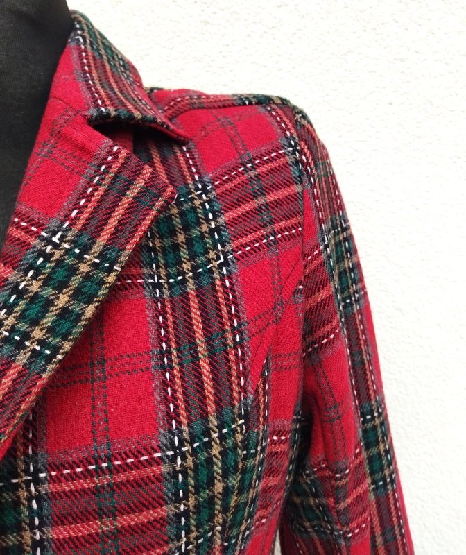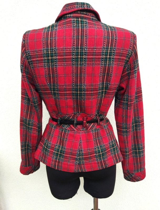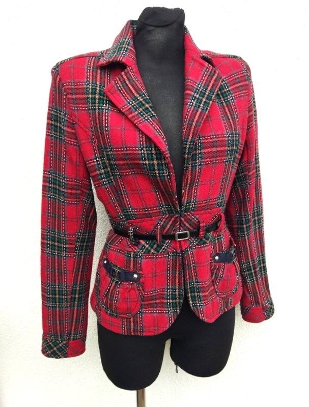 Świetny zgrabny żakiet/marynarka z tkaniny w szkocka kratę w kolorystyce czerwieni, butelkowej zieleni , czerni i bieli. Taliowana z wszytym paskiem w talii z naszywanymi szlufkami i wąskim czarnym paseczkiem z klamerką. Z kołnierzem z rewersami, Z dwiema naszywanymi kieszonkami ze zdobieniami. Zapinany na trzy haftki. Całość na podszewce.
