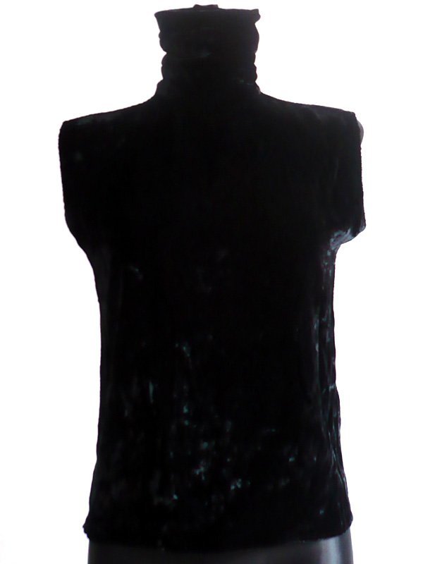 Bluzka uszyta z jedwabnego aksamitu [bardzo miła w dotyku]. Wysoka stójka. Zapinana do połowy z tyłu na guziczki.