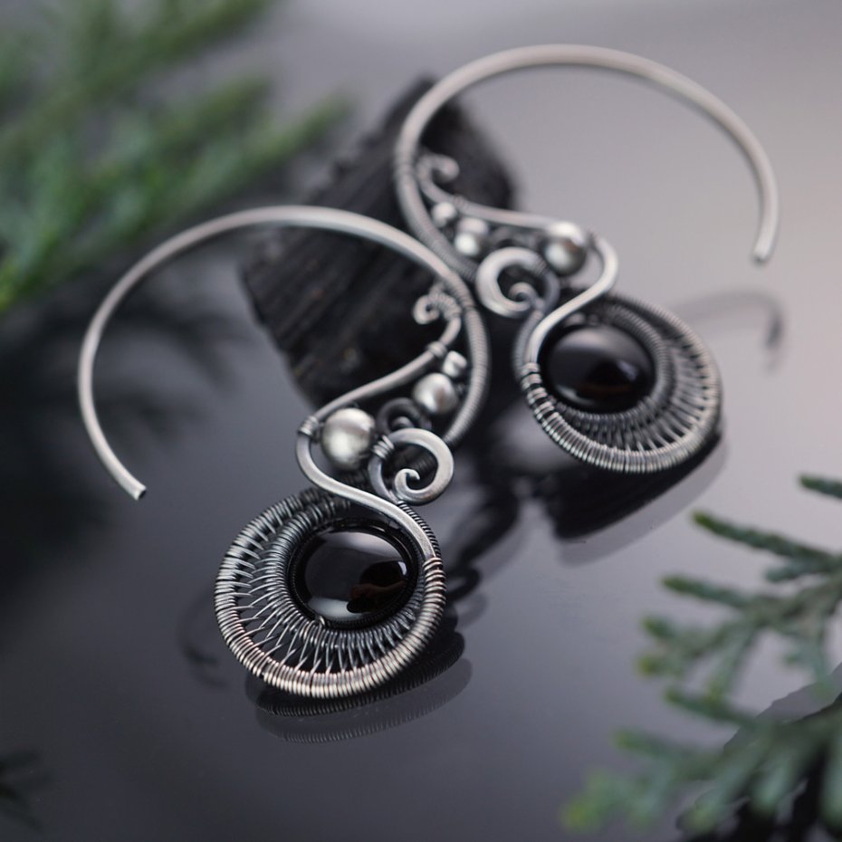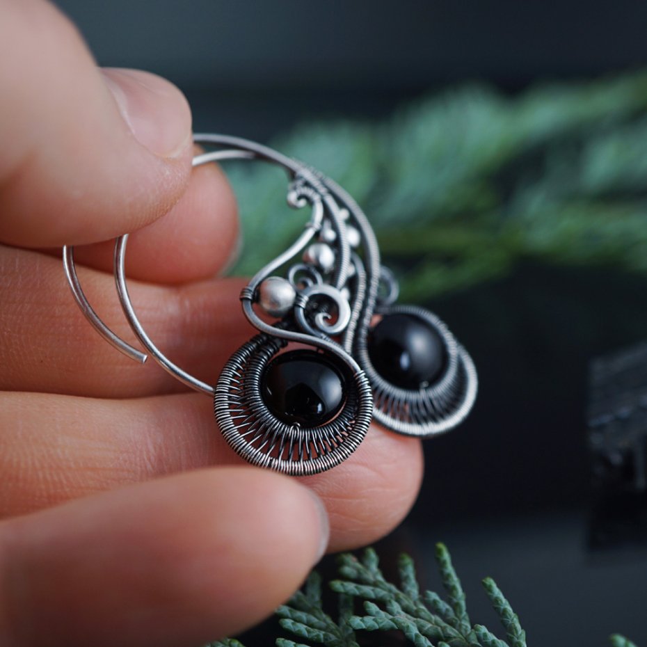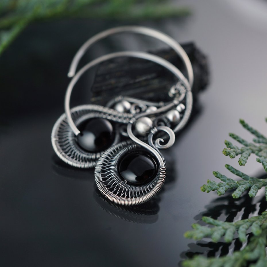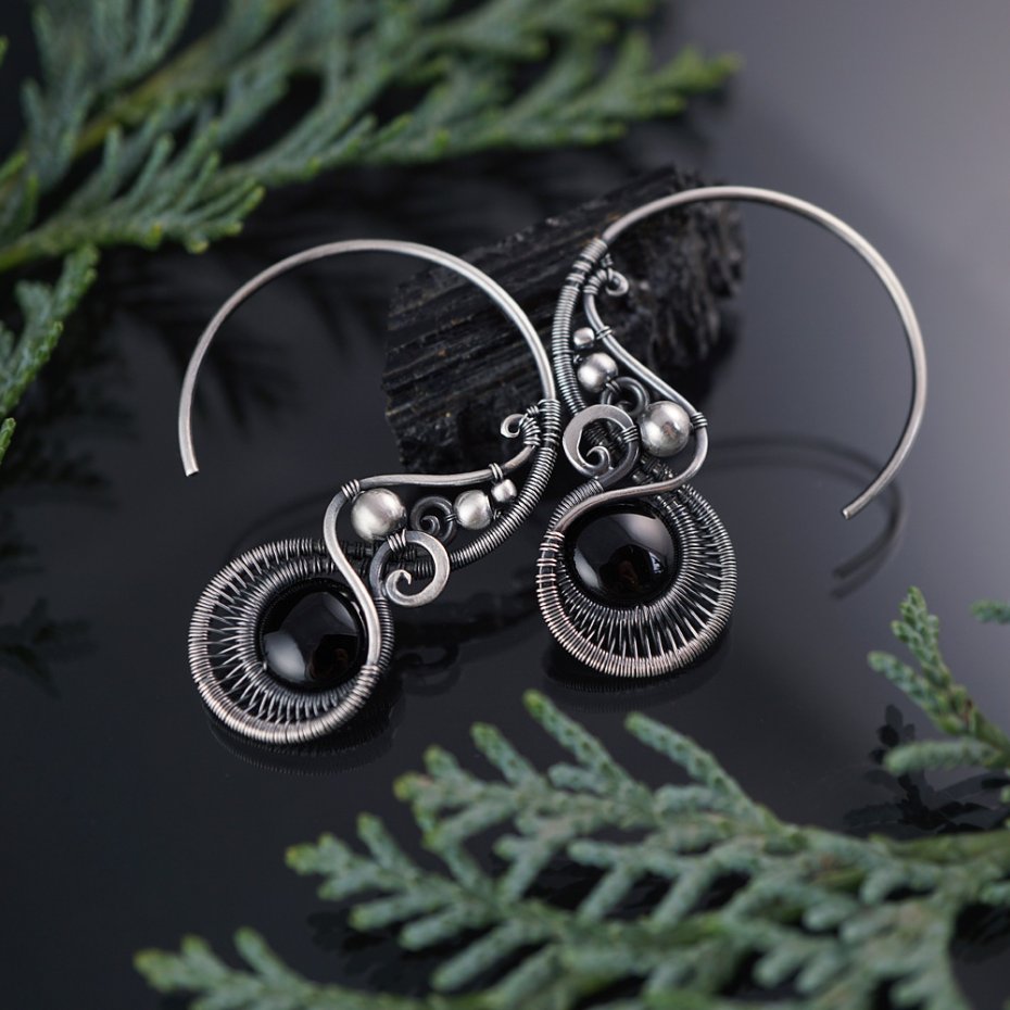 Tagi: #fantazyjne wiszące kolczyki, #kolczyki z onyksem, #prezent dla niej na urodziny, #srebrne kolczyki koła