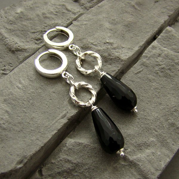 Proste, minimalistyczne i eleganckie kolczyki na co dzień i nie tylko. Wykonane w całości ze srebra próby 925 oraz fasetowanych kropli onyksu wielkości 1,6 cm. Na życzenie mogę je zoksydować. Długość całkowita to 4,8 cm. Bigle typu kajdanki. W mojej galerii naszyjnik do kompletu. Ozdobnie zapakowane.