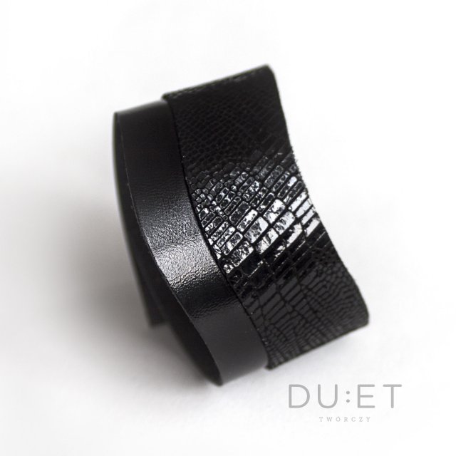 Stylowa i elegancka bransoleta o ciekawej formie podkreślającej i wysmuklającej nadgarstek. Wykonana z wysokiej jakości skór naturalnych: miękka, czarna skórka wewnątrz, czarna lakierowana i czarna licowa tłoczona we wzór krokodylej skóry. Bransoleta zapinana na metalowy knopik w kolorze srebrnym. Mięciutka, wygodna i miła dla skóry. Starannie wykonana. Wykrojona w charakterystyczną dla naszej marki falę. Pięknie podkreśla nadgarstek.