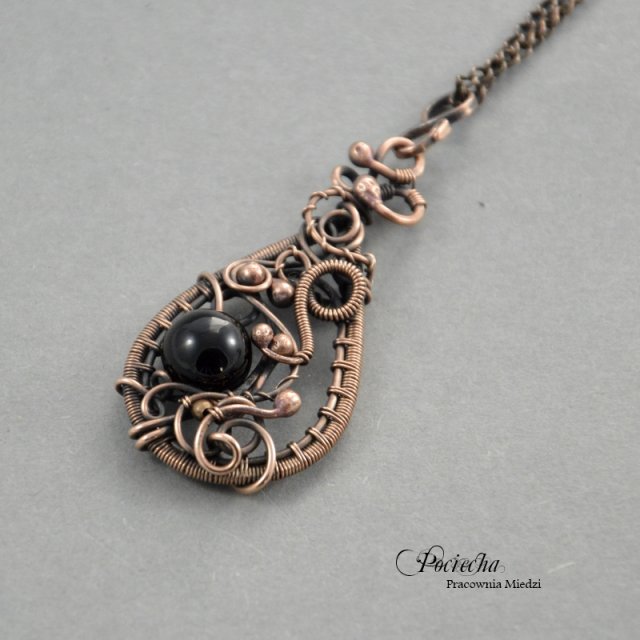 Naszyjnik stworzony z miedzi w formie wisiora zawieszonego na łańcuszku. Wisior stworzony ręcznie z miedzi i szkła. Wisior ozdobiony licznymi splotami, jego centrum stanowi szklana kulka o średnicy 10 mm. Wymiary wisiora to 6,4 x 2,6 cm.