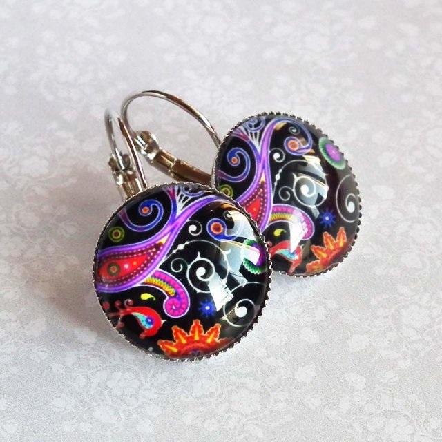 Kolczyki z oryginalną grafiką, zatopioną pod wypukłym szkiełkiem, dającym delikatny efekt trójwymiarowości i oprawioną w bazę w kolorze srebra. Grafika jest najwyższej jakości, wyraźna i nasycona. Bigle hipoalergiczne, zapinane, sztywno przymocowane do oczka, bez niklu i ołowiu. Oryginalne kaboszony- wykonane ręcznie według mojego projektu i przeze mnie, z dbałością o każdy detal.