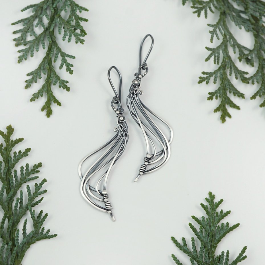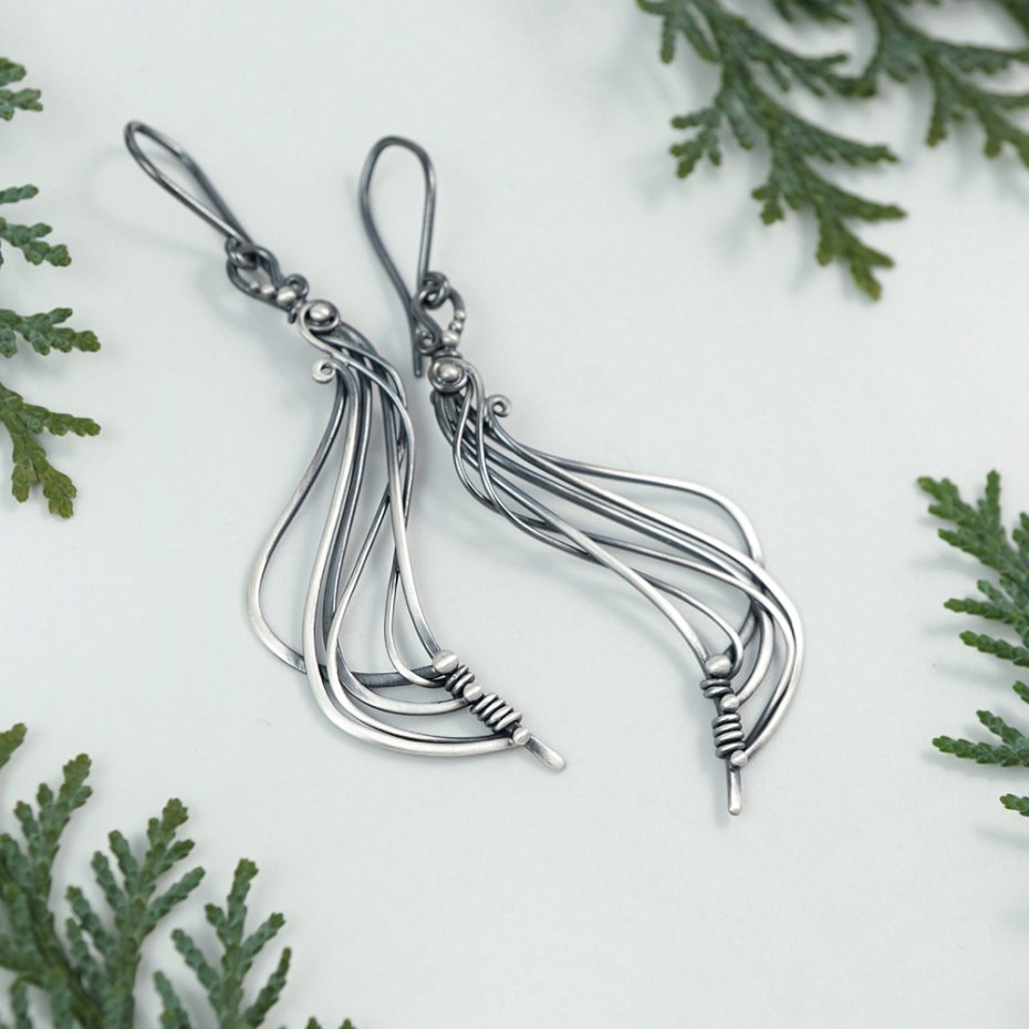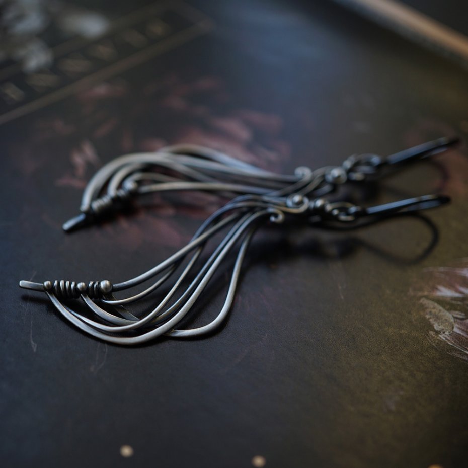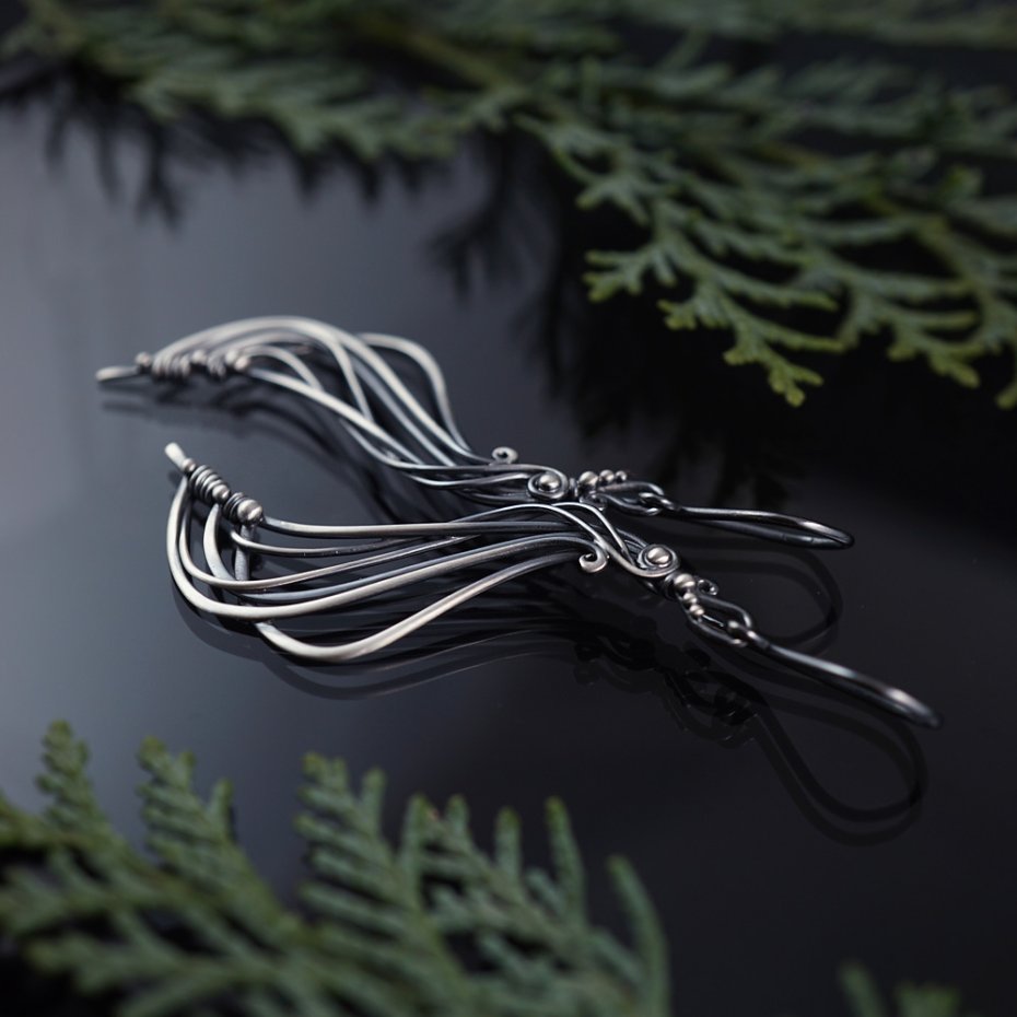 Kolczyki zaprojektowałam i wykonałam od podstaw ze srebra próby 925 (oksydowanego i miejscami przecieranego), z wykorzystaniem klasycznych technik jubilerskich oraz elementów wire wrappingu. Bigle otwarte (na życzenie mogą zostać zamienione na angielskie).