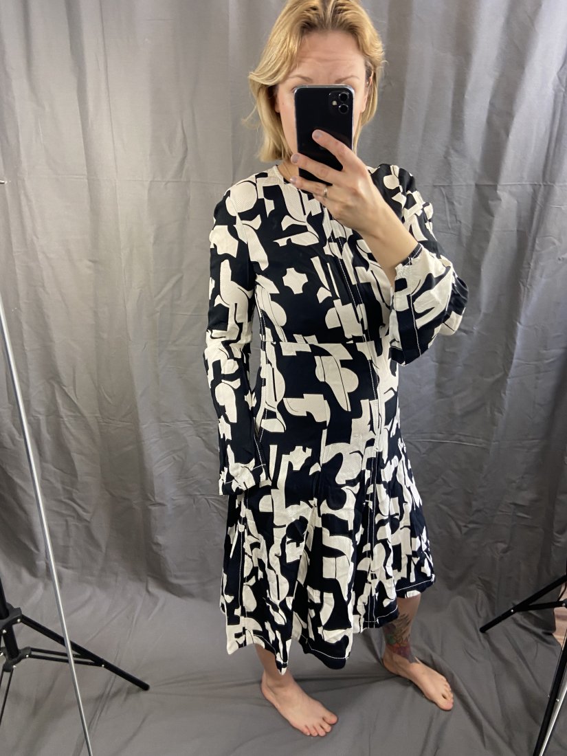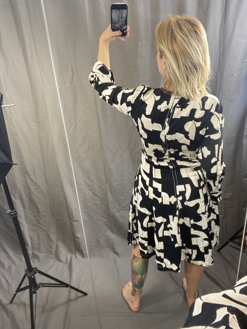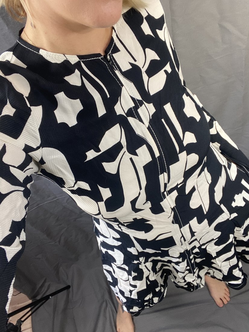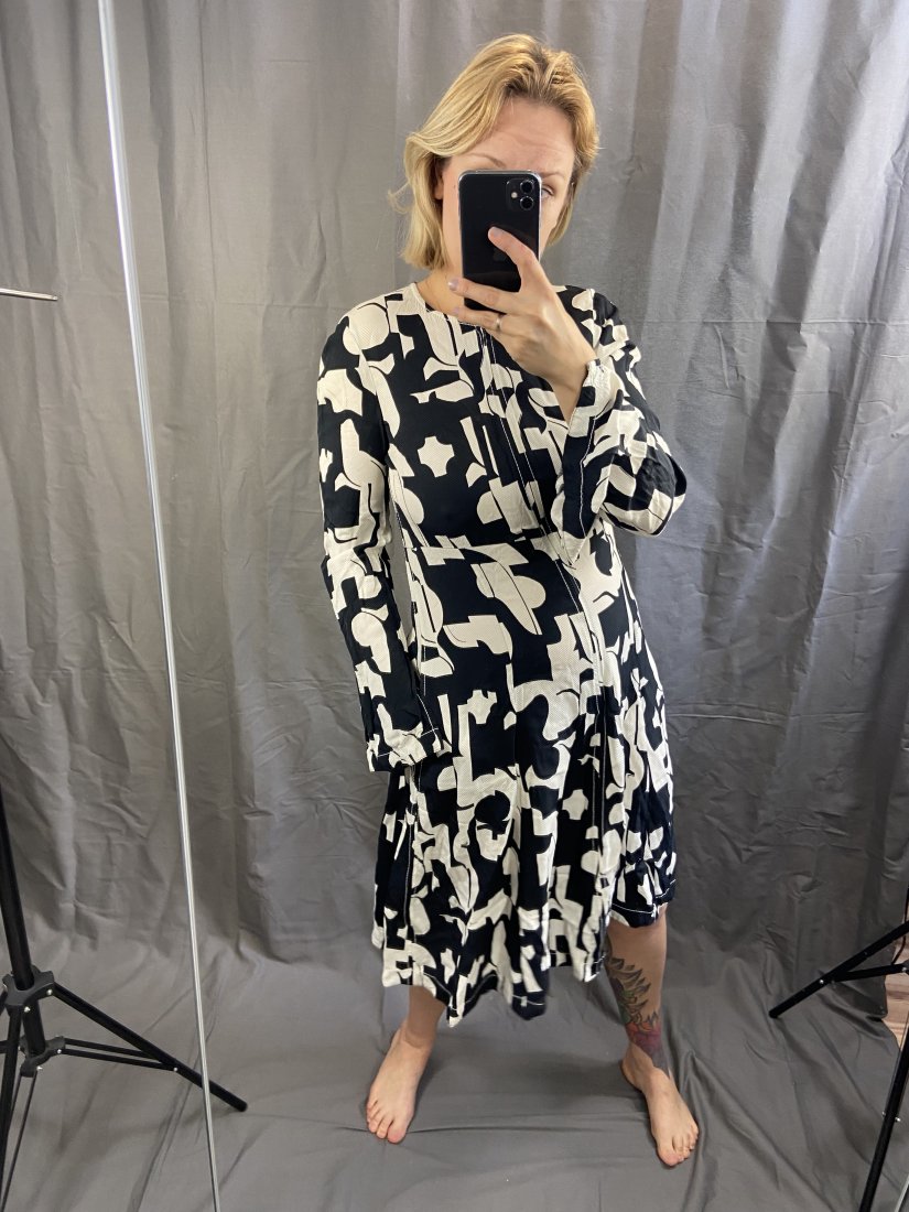 Genialnie skrojona sukienka z wiskozy. Z kieszeniami w biodrach. Dekolt zapinany na zamek kryty.
