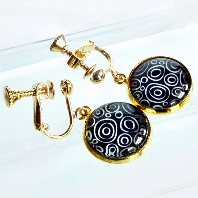 Eleganckie, małe wiszące klipsy z oryginalną grafiką artystyczną, zatopiona pod szkiełkiem, w oprawie w kolorze złota. Urocze, nieduże, delikatne klipsy. Hipoalergiczne.