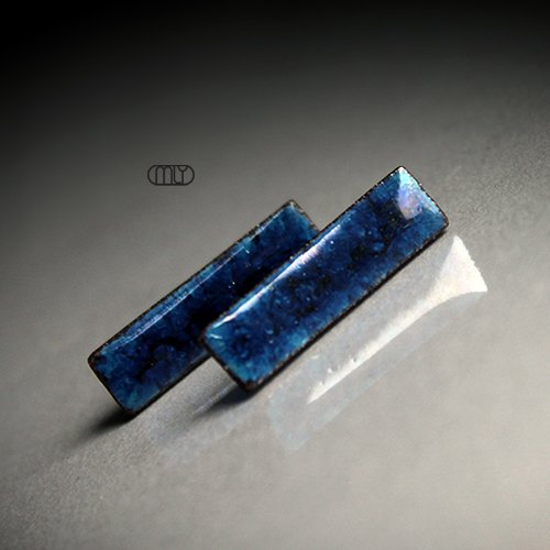 Ceramiczne podłużne kolczyki, ręcznie wykonane z delikatnej gliny kamionkowej, jednostronnie szkliwione mieszanką błękitnych szkliw z efektem plamek, tył matowy czekoladowobrązowy na antyalergicznych sztyftach.długość ok 2,5cm. Polecam