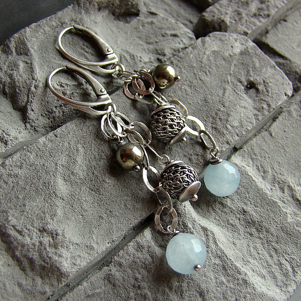 Modne, kobiece kolczyki odpowiednie na co dzień, ale nie tylko. Wykonane w całości z oksydowanego srebra próby 925 oraz fasetowanych kul błekitnego jadeitu wiekości 0,8 cm i kulek złotego pirytu wielkości 6 mm. Całkowita długość kolczyków to 6 cm. W mojej galerii bransoletka do kompletu. Ozdobnie zapakowane.