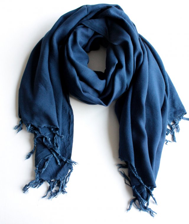 Duży, miękki szal w głębokim odcieniu błękitu pruskiego. Materiał to prawdopodobnie wiskoza.