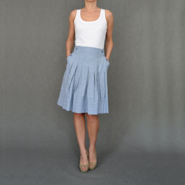 Jasno błękitna spódniczka TOPSHOP z bawełny i lnu. Krój rozszerzany, z kontrafałdami. Po bokach kieszonki ozdobione guziczkami. Polecam.