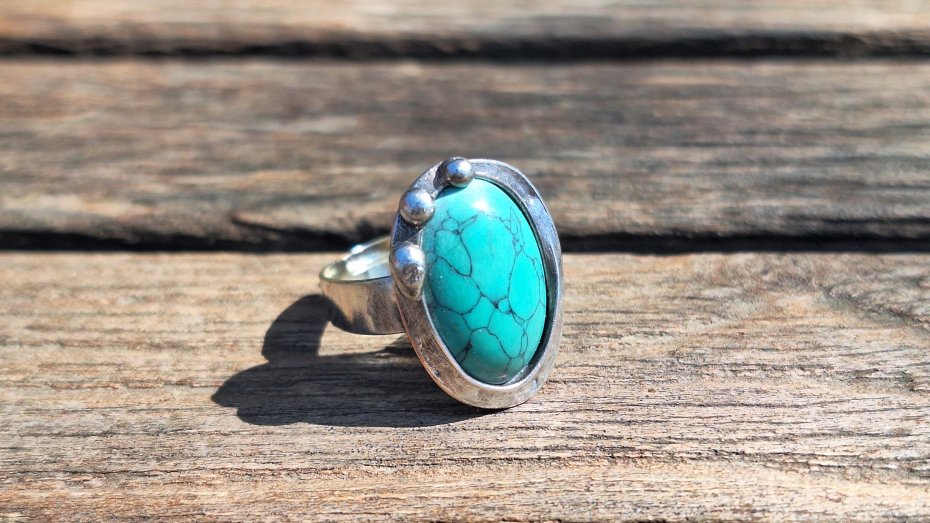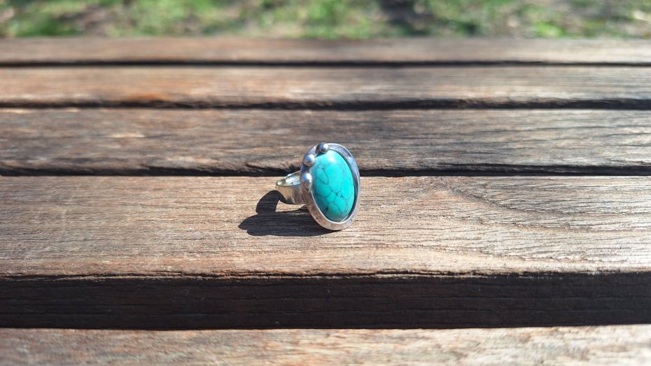 Pierścionek wykonany z miedzi, cyny i howlitu. Wymiary ok. 2 na 1.5 cm. Regulowany. Nie jest ciężki.
