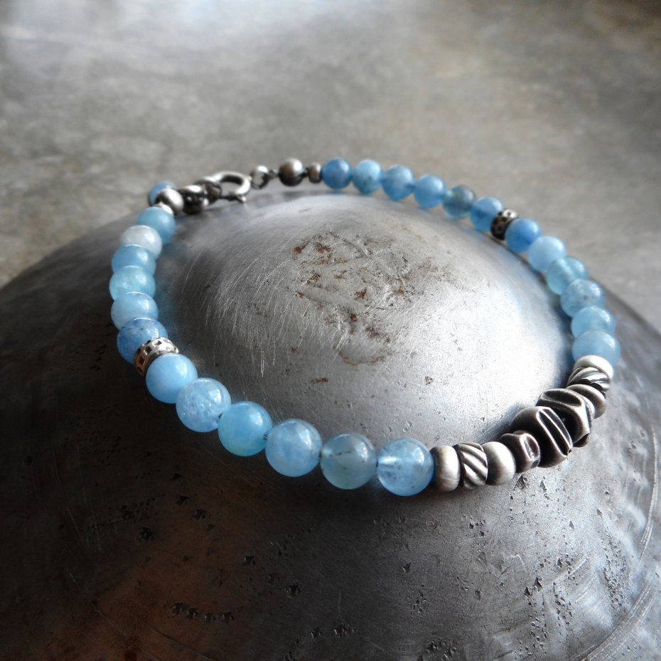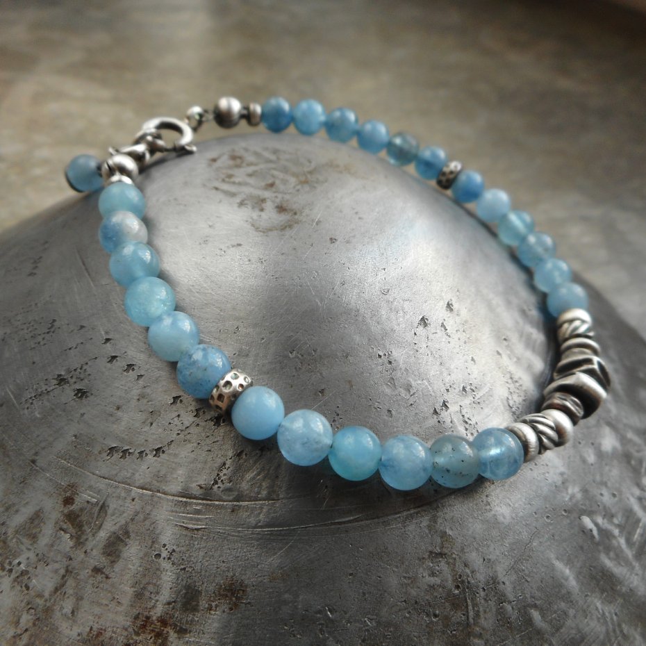 Piękna bransoletka z kamieni naturalnych i szlachetnego srebra; klasyczna i elegancka, błękitnymi akwamarynami (wysoka jakość) przekładanymi srebrnymi gniecionymi przekładkami.