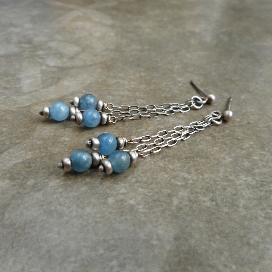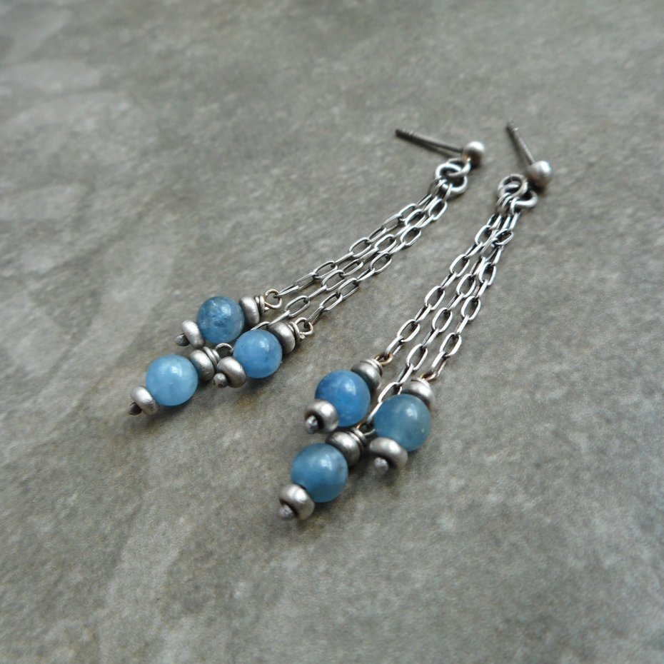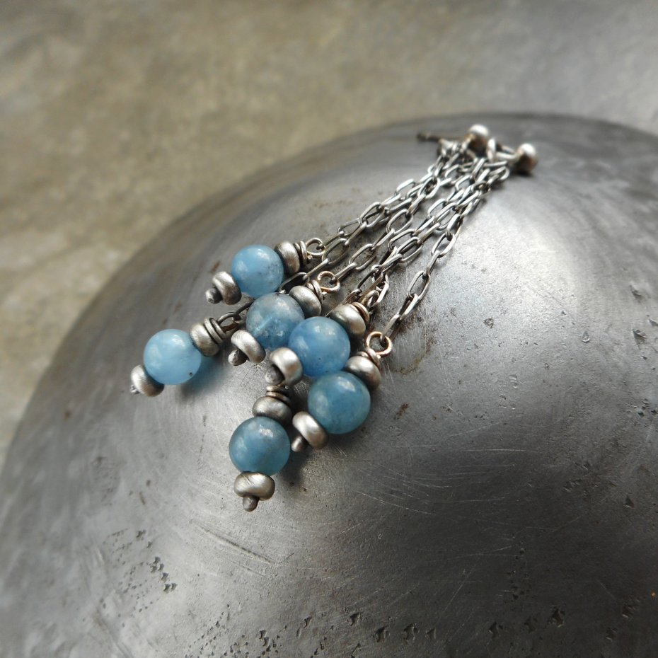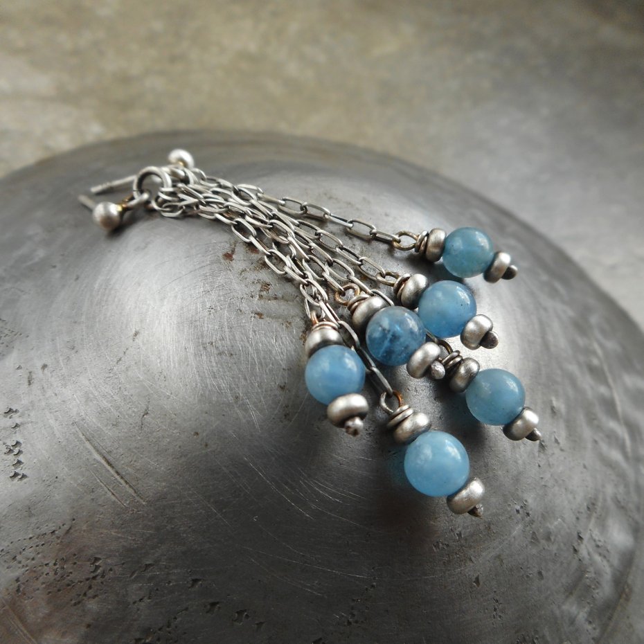 Kobiece, proste w formie kolczyki z kamieni naturalnych i szlachetnego srebra; nie obciążające ucha, zwiewne, ich ozdobą są akwamaryny w pięknym czystym odcieniu błękitu.