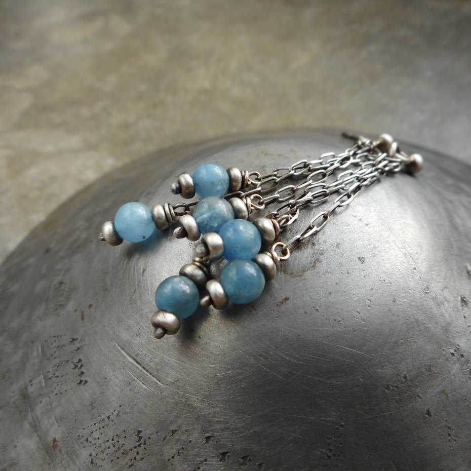 Kobiece, proste w formie kolczyki z kamieni naturalnych i szlachetnego srebra; nie obciążające ucha, zwiewne, ich ozdobą są akwamaryny w pięknym czystym odcieniu błękitu.