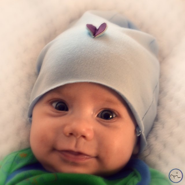 Śliczna czapeczka z błękitnej elastycznej dzianiny oraz fioletowej pianki. Obwód czapeczki 40 cm. Możliwość zamówienia dowolnego rozmiaru. Czas oczekiwania na wykonanie zamówienia do 7dni.