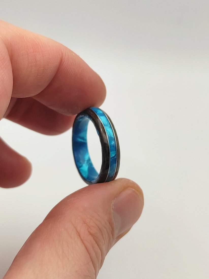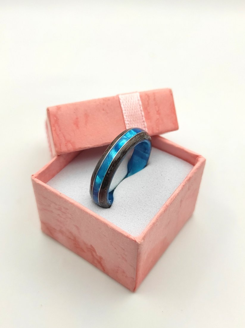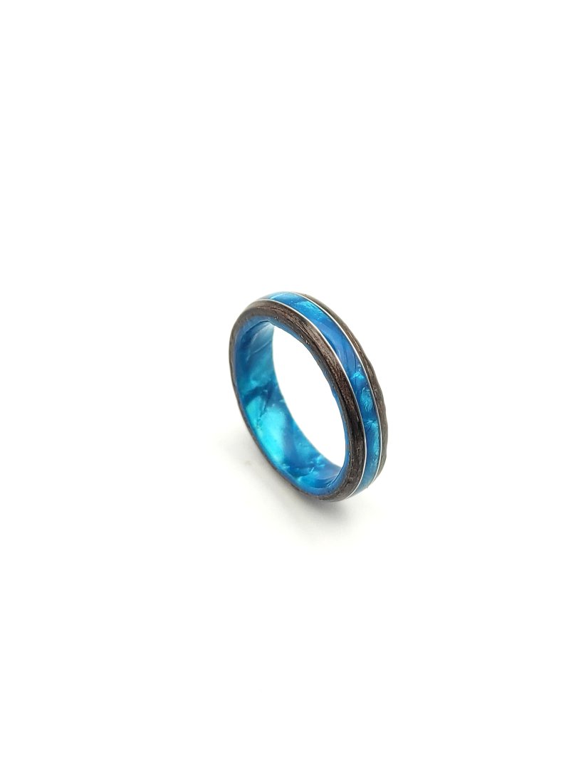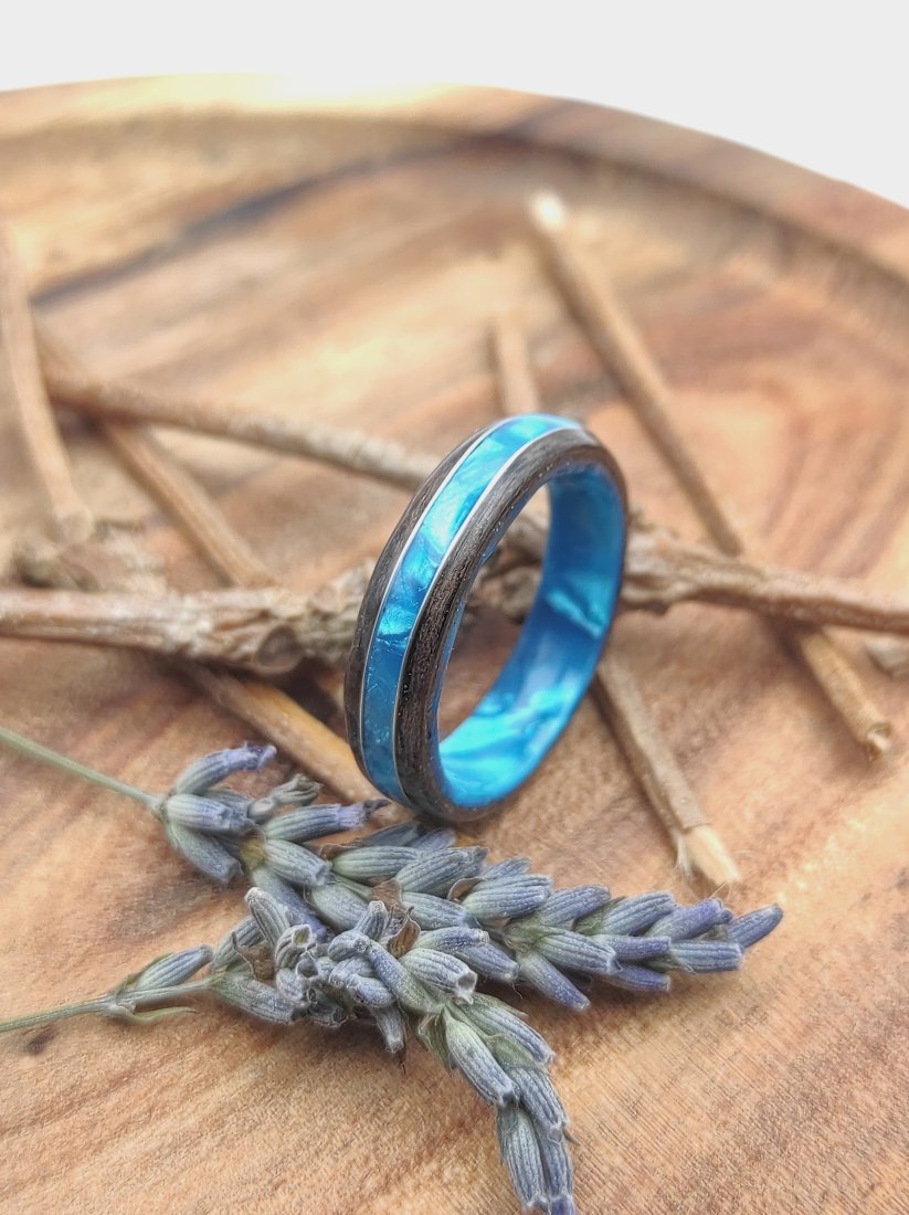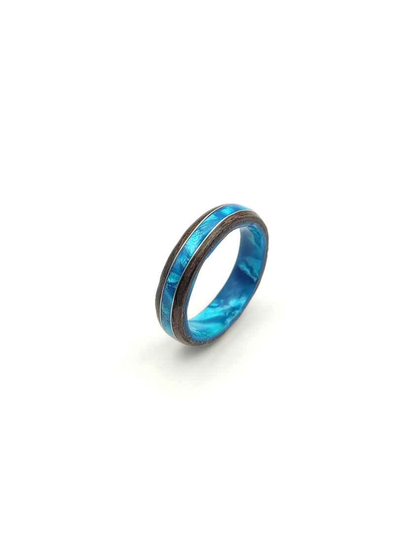 Pierścionek Błękitna Głębia to ręcznie wykonane połączenie forniru orzechowego z jasnoniebieskim celuoidem, przedzielone delikatnym ciemnym drucikiem.