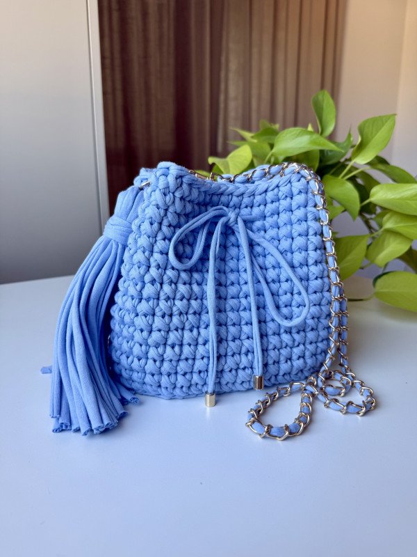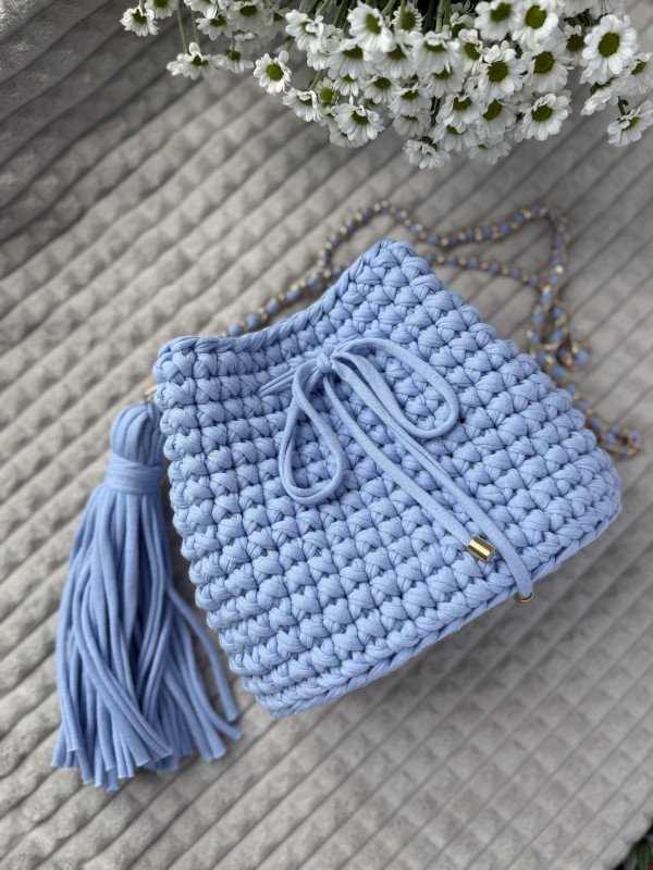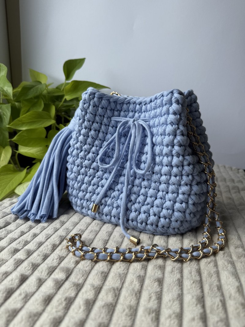 Elegancka torebka typu worek, wykonana ręcznie na szydełku z wysokiej jakości bawełnianej włóczki.