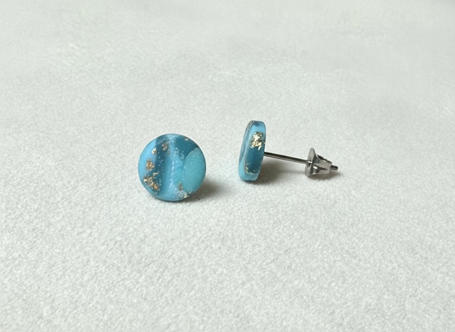 Delikatne, a jednocześnie przyciągające wzrok kolczyki – sztyfty o subtelnym, okrągłym kształcie. Wykonane ręcznie z gliny polimerowej w szlachetnym odcieniu błękitu i ozdobione subtelnymi złotymi drobinkami, które nadają im elegancji i niepowtarzalności.