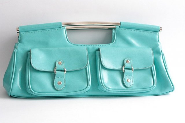 Błękitna torba wykonana prawdopodobnie ze skóry ekologicznej, zapinana na magnesy. Uwagę zwraca nietypowy, metalowy uchwyt.